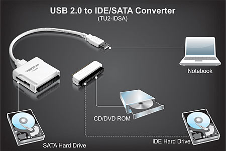 The USB 2.0 to SATA / IDE Converter allows users to use IDE or SATA hard drives over a USB 2.0 connection. It works with most IDE (up to ATA 133) and SATA 1.0a devices. This device provides a simple, yet powerful data transfer and backup solution.