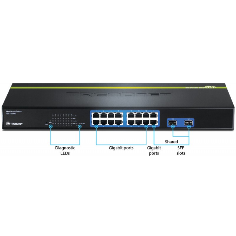 The 16-Port Gigabit Web Smart Switch with 2 Shared Mini-GBIC Slots (model TEG-160WS) delivers a 32 Gbps switching capacity with managed layer 2 features at a reduced cost. Support for SNMP v1, 802.1X, STP, 802.1Q VLAN, QoS, IGMP snooping, Broadcast Storm Control and port Trunking provides a cost effective, scalable and secure backbone switch solution for SMB networks.