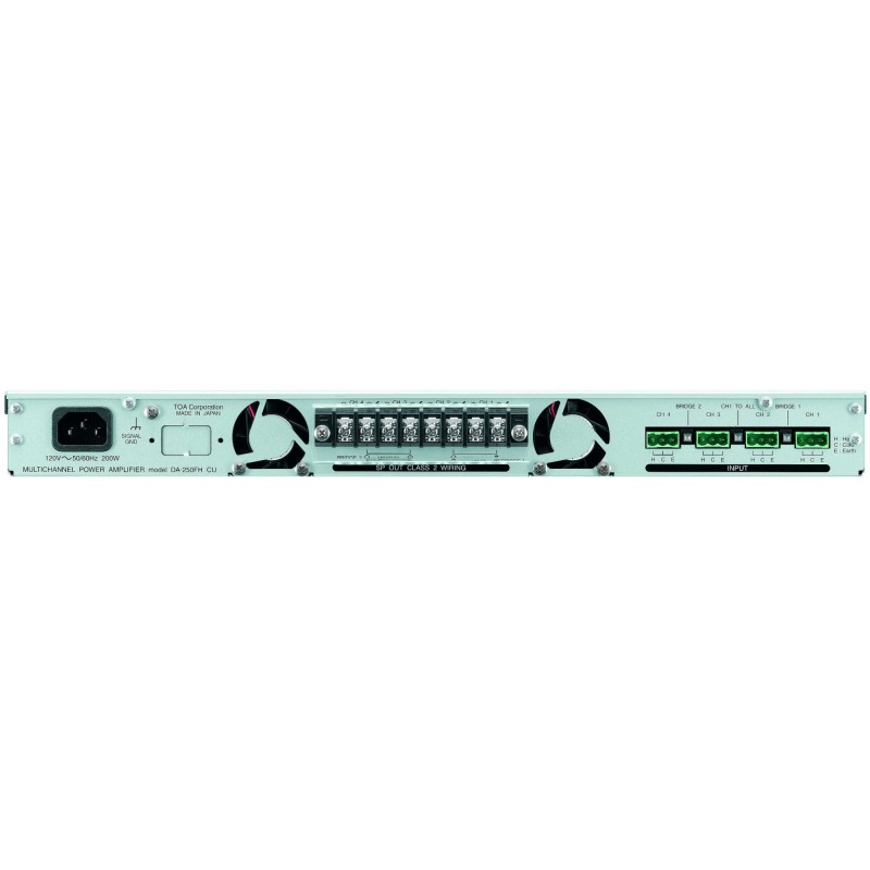 The DA-250FH is a 4-Channel Digital Power Amplifier designed for 100 V line high-impedance distribution and features lightweight, compact, high power output, and high efficiency. It delivers 250 W 4 channels (40 output) using a switching power supply. Each channel is equipped with an independent power section. It can be electrically isolated from the high-impedance speaker system by attaching the MT-251H Output Transformer (optional). It can be mounted in an EIA Standard equipment rack (1 unit size).
