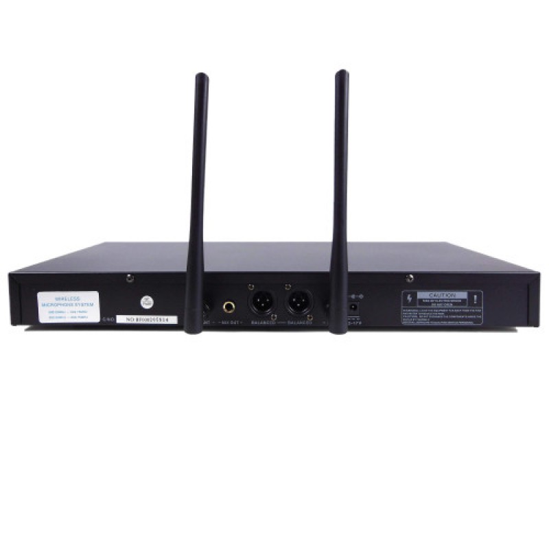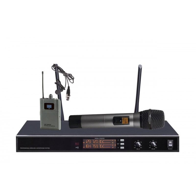 ESL KX-D3912 WIRELESS MICROPHONE system consists of a lavalier and a handheld microphone. The devices have a two channel adjustable frequency and an LCD screen showing the operation status. Microphones work at a distance of 50-70 m for 5 hours.