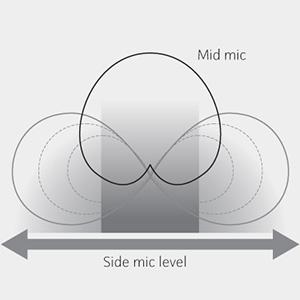 Mid-SideThe 'Mid' microphone element in the H2n's MS mic picks up signal coming from directly in front, while the 'Side' mics capture the sounds coming from the left and right. You can then adjust the relative level of each, either during recording or during post-production, to alter the stereo width while still maintaining perfect mono compatibility. |